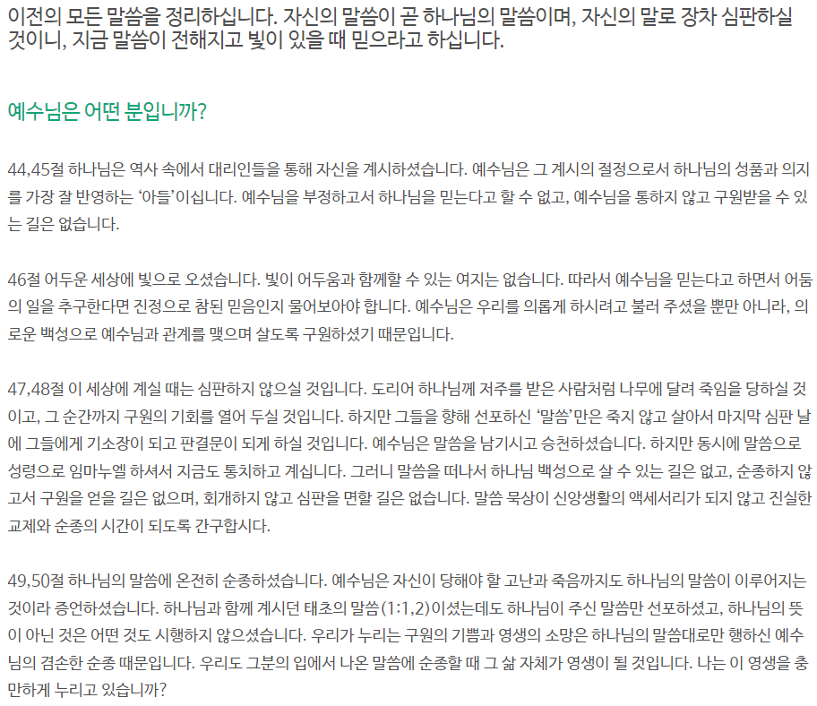 [성경본문] 요한복음12:44-50절 개역개정44. 예수께서 외쳐 이르시되 나를 믿는 자는 나를 믿는 것이 아니요 나를 보내신 이를 믿는 것이며 45. 나를 보는 자는 나를 보내신 이를 보는 것이니라 46. 나는 빛으로 세상에 왔나니 무릇 나를 믿는 자로 어둠에 거하지 않게 하려 함이로라 47. 사람이 내 말을 듣고 지키지 아니할지라도 내가 그를 심판하지 아니하노라 내가 온 것은 세상을 심판하려 함이 아니요 세상을 구원하려 함이로라 48. 나를 저버리고 내 말을 받지 아니하는 자를 심판할 이가 있으니 곧 내가 한 그 말이 마지막 날에 그를 심판하리라 49. 내가 내 자의로 말한 것이 아니요 나를 보내신 아버지께서 내가 말할 것과 이를 것을 친히 명령하여 주셨으니 50. 나는 그의 명령이 영생인 줄 아노라 그러므로 내가 이르는 것은 내 아버지께서 내게 말씀하신 그대로니라 하시니라